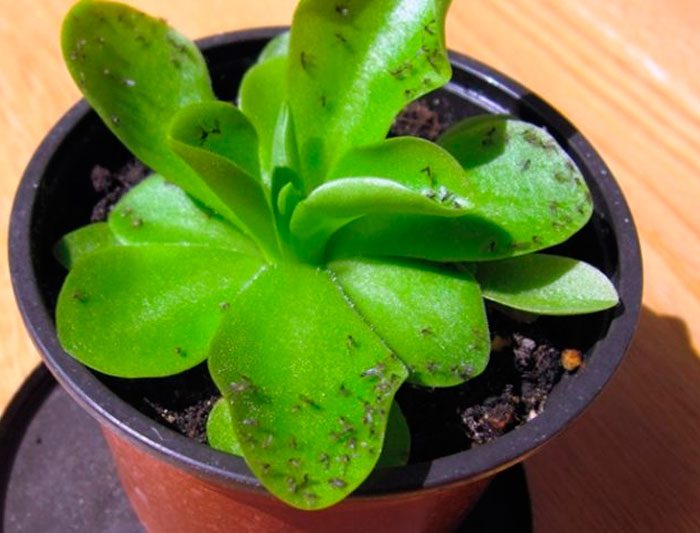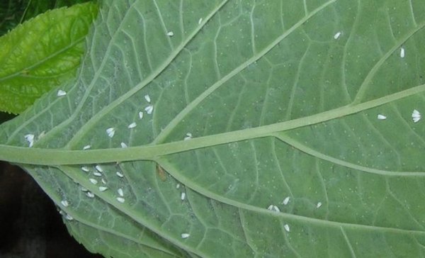 - Mitges blanques (puces de terra, mosca blanca, mosques de fruita, estanys), que han escollit un pot de flors, s’instal·len a la capa superior del sòl, creant un revestiment blanc. Tenen un color groguenc groguenc o blanc i arriben a una mida d’uns 1 mm.