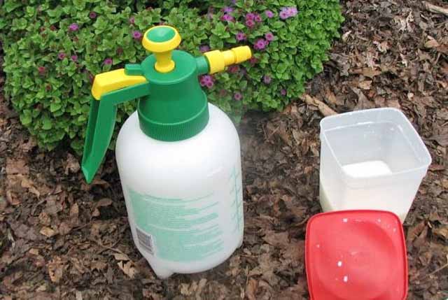 Els components clau es creixen en contenidors separats. S'utilitza aigua escalfada, però la temperatura del líquid no ha de superar els 50 ° C. Primer, la pols es dissol en una petita quantitat d’aigua i, a continuació, s’afegeix el residu lentament, aconseguint 9 l del volum total. En un altre recipient, es dilueix 1 litre d’aigua amb calç i, a continuació, es separen les fraccions sòlides filtrant per gasa.