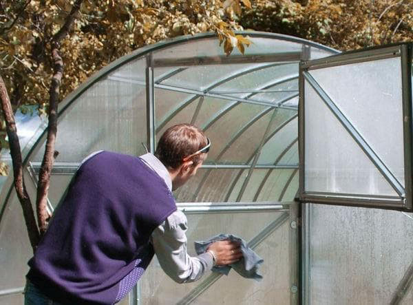 Al període de tardor, els hivernacles es tracten amb compostos a base de sulfat de coure. L’hivernacle es renta amb sabó de roba, que es dissol en l’aigua. Per a una solució de sabó, es dilueixen 20 g de sabó en un litre de líquid. Al sòl d’hivernacle s’afegeix una solució de lleixiu, que conté 300-400 g de calç per cada 10 litres d’aigua. En 1 m2 feu 1 litre de la mescla.