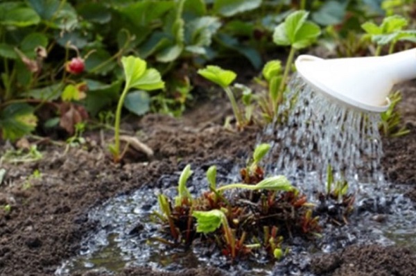 Podeu regar els arbustos amb una solució de nitrofoska. En una galleda d’aigua criada 2 cda. l la droga. Per millorar l'efecte en la solució, afegiu 1 cda. l nitrat de potassi La composició es barreja fins que els fertilitzants es dissolguin completament i es rega les maduixes a raó d’1 litre per planta.