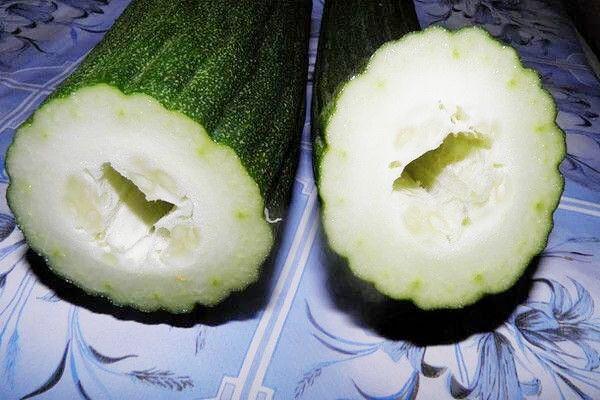 Entendre que els cogombres estan buits al seu interior, és possible per l’aparició de la fruita. La superfície de la verdor buida està arrugada. Són lleugerament còncaus cap a l’interior. El pes dels fons verds buits és molt inferior al previst. Per fi podeu assegurar-vos que hi ha espais buits tallant la fruita.