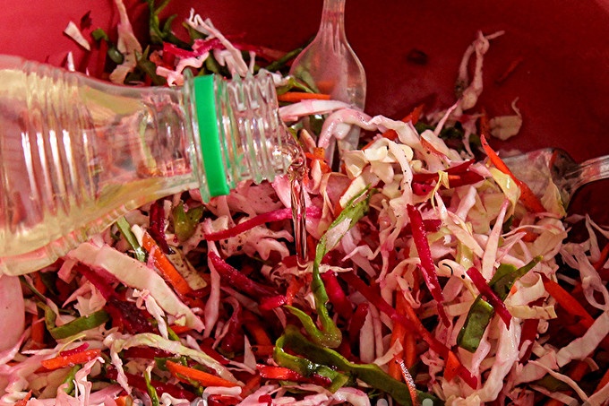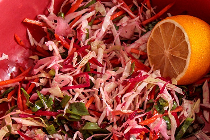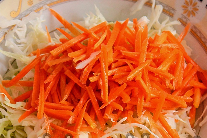 D’un cap de col tallem un tros petit. Triturar amb una fina palla. Si la col no és gaire sucosa o amb fulles molt dures, afegiu-hi una mica de sal i fregueu-la amb les mans.