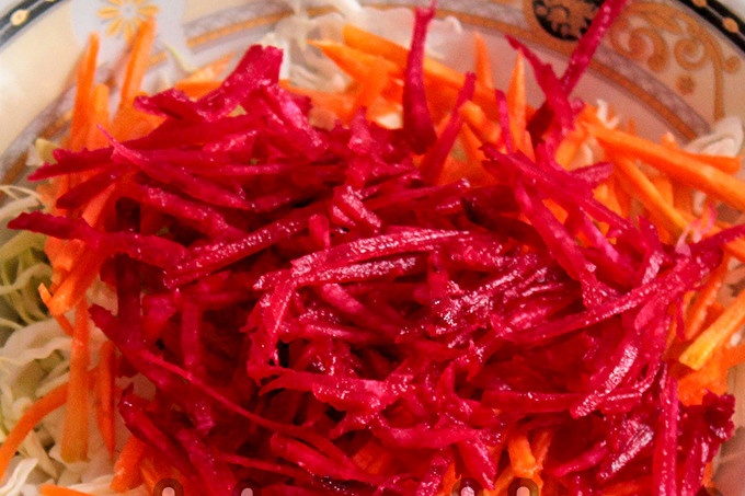 Netegem la remolatxa, esbandim-ne tres en una ratlladora fina. Abans d’afegir-lo a l’amanida, intentem tastar-en algunes ocasions la remolatxa és amarga, és millor rebutjar aquest tipus de verdures, l’amanida resultarà insípida. En aquest cas, podeu substituir-lo per carbassa o fer només pastanagues i col.