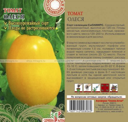 Varietats de tomàquet Olesya: de gran rendiment. D’un arbust podeu obtenir més de 5 kg de fruites. La durada de la maduració oscil·la fins als 110 dies. Un rendiment excel·lent es deu al fet que la planta és resistent a malalties perilloses i a molts tipus de plagues, tolera normalment factors nocius i no té por als canvis lleugers de temperatura.