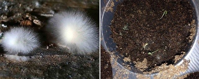 A més d’aquests motius, els processos biològics també afecten l’aparició de la placa. Un d’aquests factors és el dels fongs, que es formen a partir d’un sagnia. De vegades, a la composició del sòl comprat ja hi ha motlle. No és perillós per als cultius ja cultivats, però és desastrós per a les plantes joves, ja que penetra fins al fons de la cassola. Des d’aquesta terra s’ha de desfer.