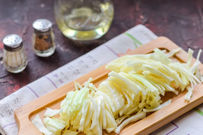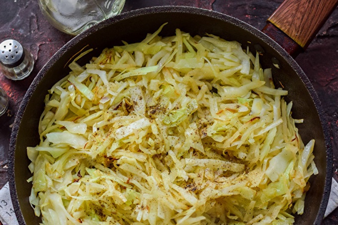 Escalfeu una cullerada d’oli vegetal en una paella, canvieu la col, fregiu la col durant 8-10 minuts a foc lent. Afegiu-hi sal i pebre negre mòlt a la col. Opcionalment, podeu afegir a les espècies de col.