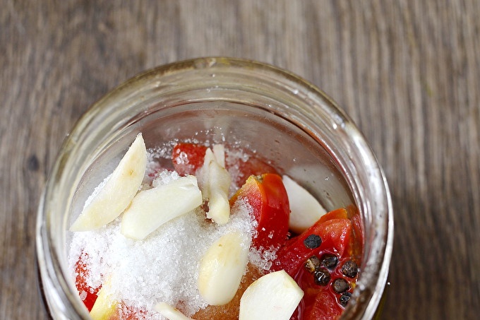 Ara poseu els tomàquets en un pot esterilitzat, en algun lloc de l’ocupació. Aboqueu-los sucre, sal, vinagre i mantega, ajusteu-los.