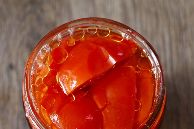 Tomàquets, en escabetx amb rodanxes d’all, dits de xori