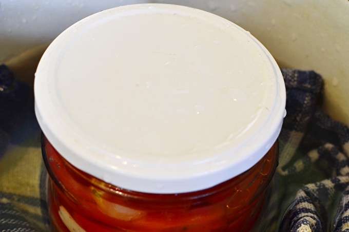 La part superior del flascó es tanca a mà o bé amb una tapa i ho frega a fons, de manera que totes les verdures estiguin planes. Ompliu de nou els espais restants de la gerra amb tomàquets i ompliu-los amb aigua bullint.