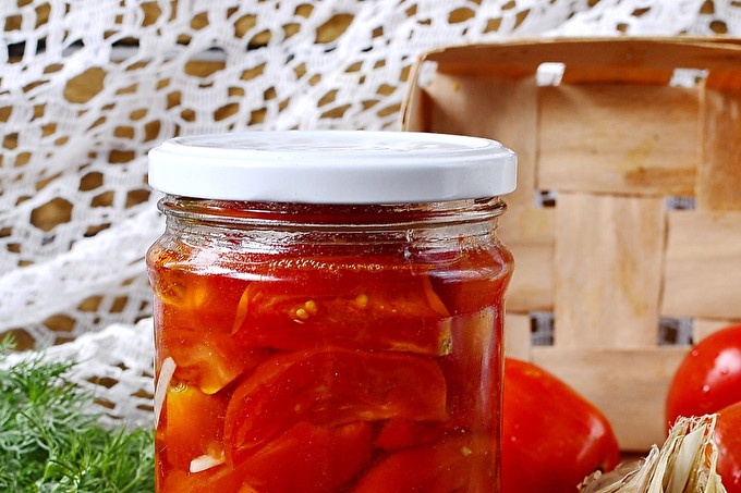 Aquesta recepta per a la conservació és una mica diferent, ja que aquí tanquem els tomàquets no en forma de puré de patates, sinó en rodanxes. Per al que la gent estima aquests tipus de conservació, és per la seva variabilitat en ús. Es poden servir com a aperitiu a la taula, en forma d’una amanida, en forma de salsa, salsa o salsa de carn. Les gerres amb tal preservació clarament no es queden a les parets fosques de soterranis i cellers, però durant l'hivern es mengen amb gana per part de convidats i hostes.