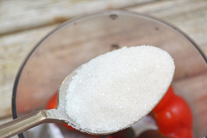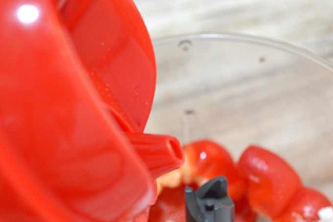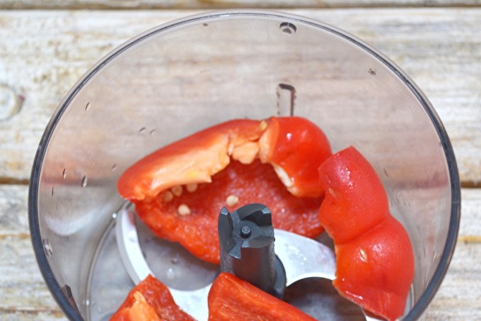 Primer, prepareu l’adob: talleu els pebrots dolços a trossos grans. Enviat al bol de liquadora.