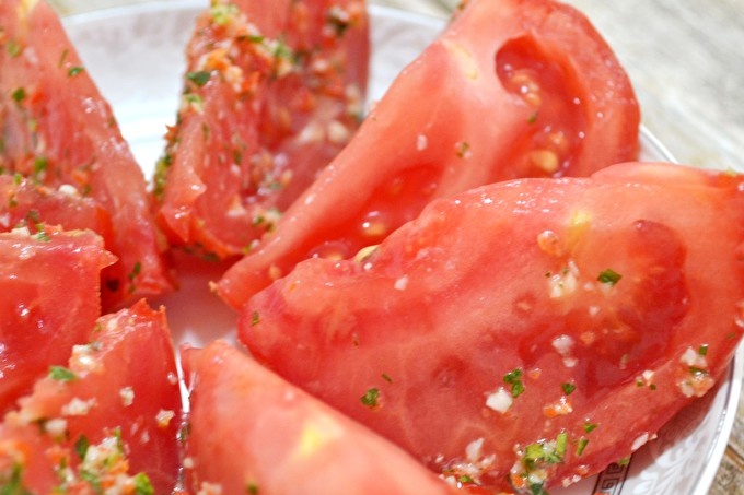 Prepareu els tomàquets: blanquejar i després tallar-los a rodanxes grans.