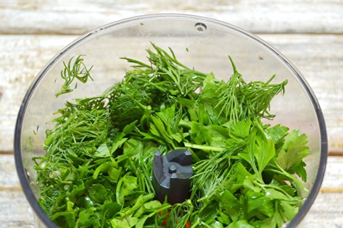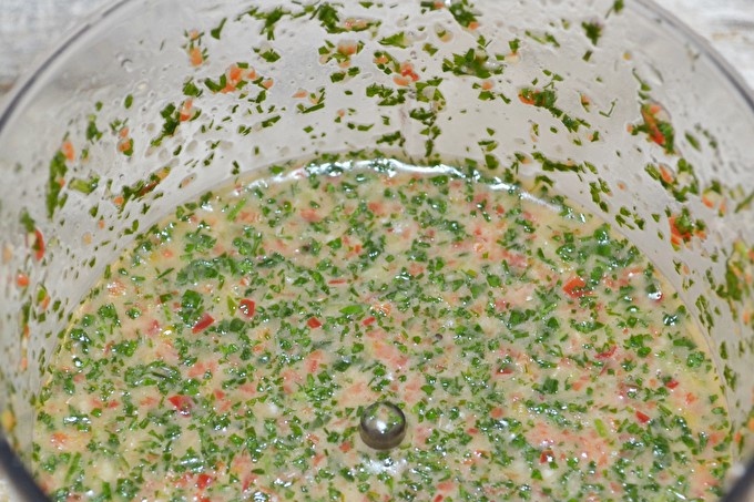 Tot interromput per una batedora. Aboqueu la quantitat d’oli especificada als ingredients triturats, poseu sal i sucre en vinagre, barregeu-ho fins que quedi homogeni.