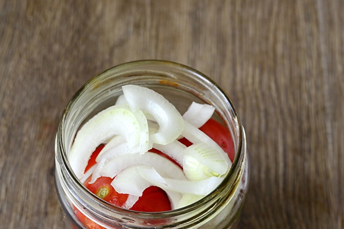 En gerres esterilitzades netes imposen amb força els tomàquets intercalats amb cebes.