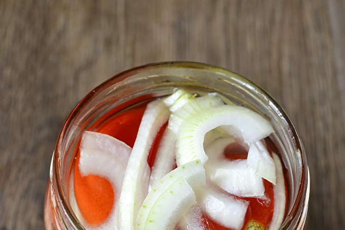 Amb les cebes treure la closca i tallar-la en semibiólars. Aboqui-hi 2000 ml d’aigua pura en un recipient adequat, afegiu-hi 60 grams de sal de cuina, 100 grams de sucre, pèsols, clavells i fulls de llorer secs. Posem la salmorra futura a l'estufa i esperem fins que bulli. A continuació, afegiu 25 ml de vinagre i gelatina al 9%, que abans vam omplir d'aigua. Bulliu la salmorra durant tres minuts més.