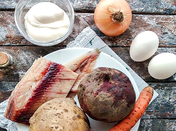 Prepararem tots els ingredients necessaris. El meu arengada es renta bé amb aigua corrent i es talla en filets. Bulliu les verdures amb aigua salada fins que estiguin fetes. Cuini els ous durant 8-10 minuts després de bullir l'aigua i deixeu-los refredar completament.