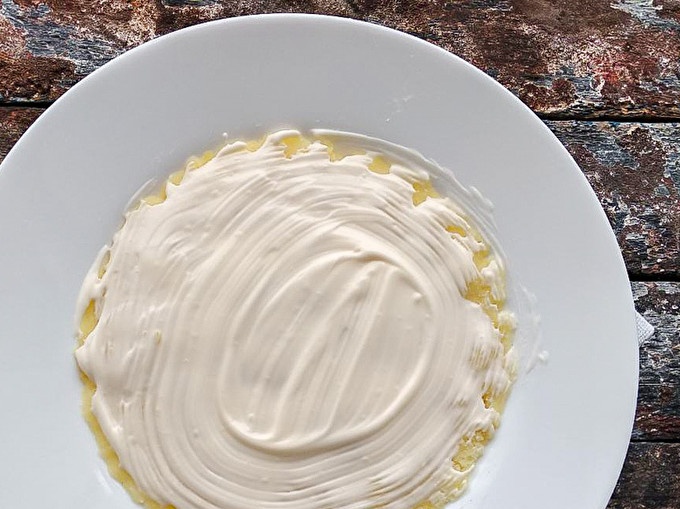 Poseu-vos el greix de forma suau amb maionesa i envieu l'amanida a la nevera durant 2-3 hores perquè estigui ben xop.