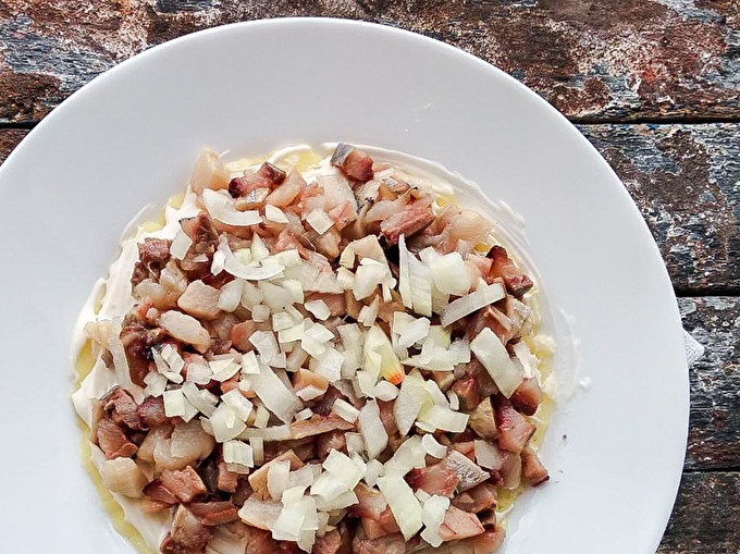 A la part superior de les patates, poseu-vos l'arengada picada amb ceba.