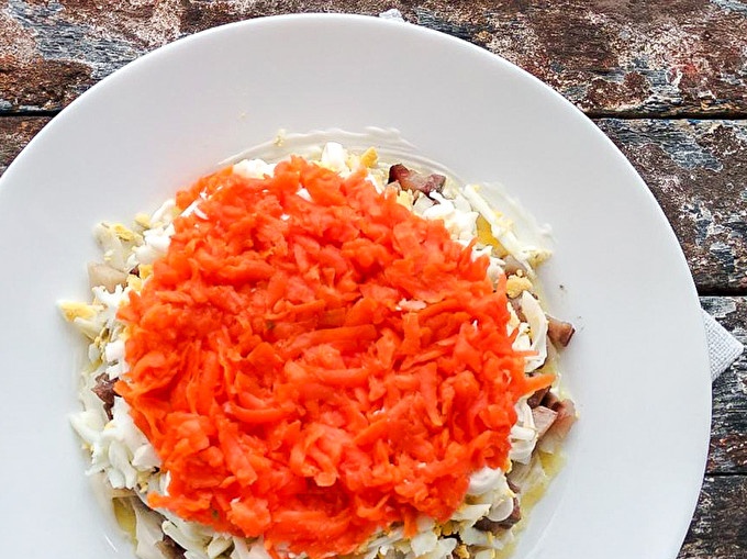 Feu la darrera capa de remolatxa. Peleu les remolatxes bullides, reneu-les amb un ratllador mitjà i cobreixi l'amanida de tots els costats.
