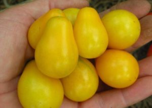 Els fruits són petits, la forma original en forma de "peres" o "gotetes", de color groc saturat. Deliciós, sucós, amb tons de mel característics. Formació del canell, pel nombre de tomàquets - 20-30 peces. Ús principal: menjar fresc (com els dolços), per a la conservació, decoració de plats culinaris.