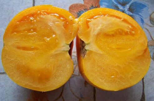En els arbustos baixos d’aquesta varietat de tomàquets es formen fruites groc-taronja. El pes: 150 grams, el gust per a un híbrid és bo. Hi ha un alt contingut de beta-carotè.