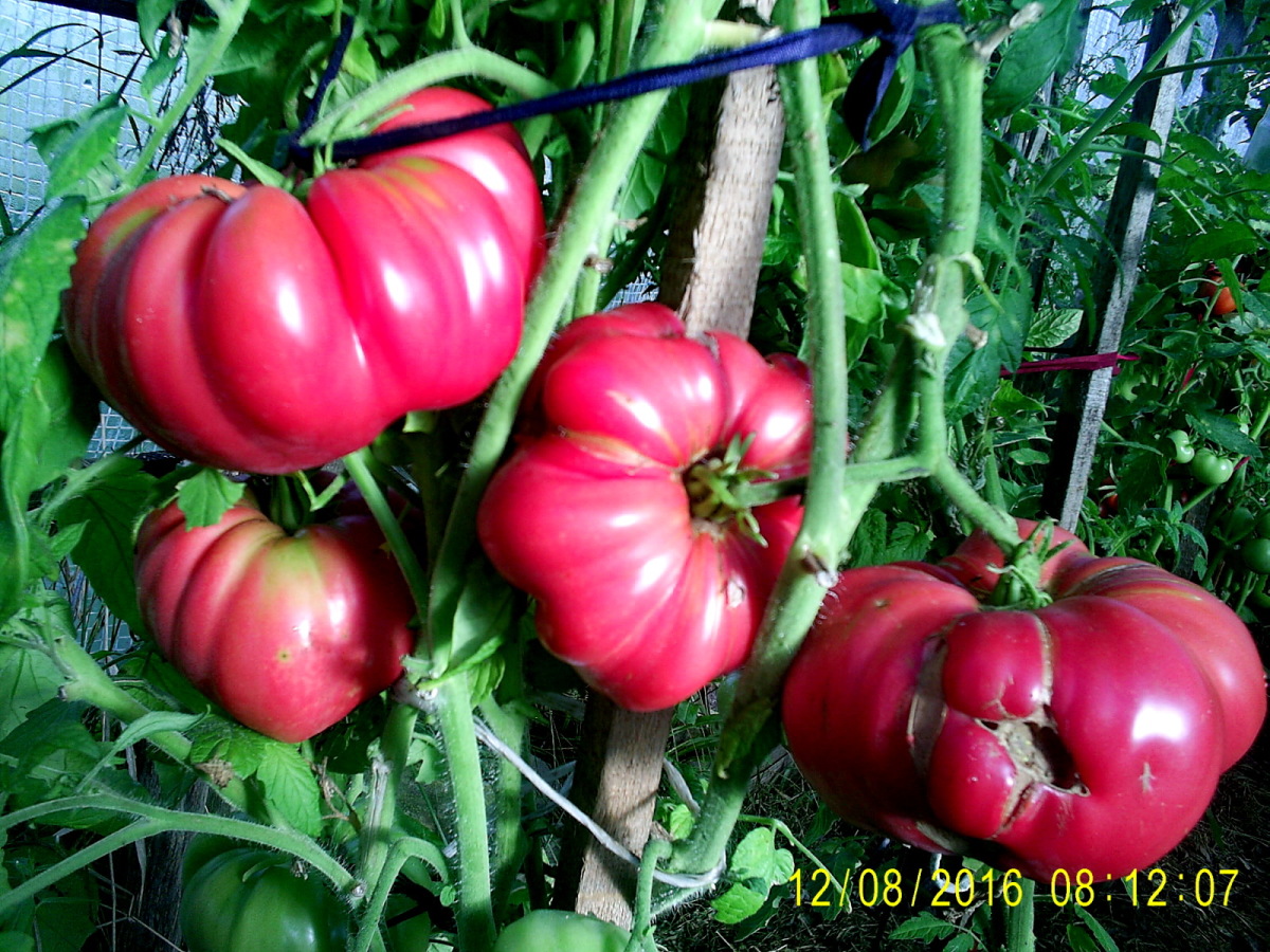 No és un arbust alt que és difícil conservar els fruits de 250 g, per la qual cosa requereix una lliga. Els tomàquets són rodons, densos lleugerament acanalats, amb 6 nius i gust meravellós.