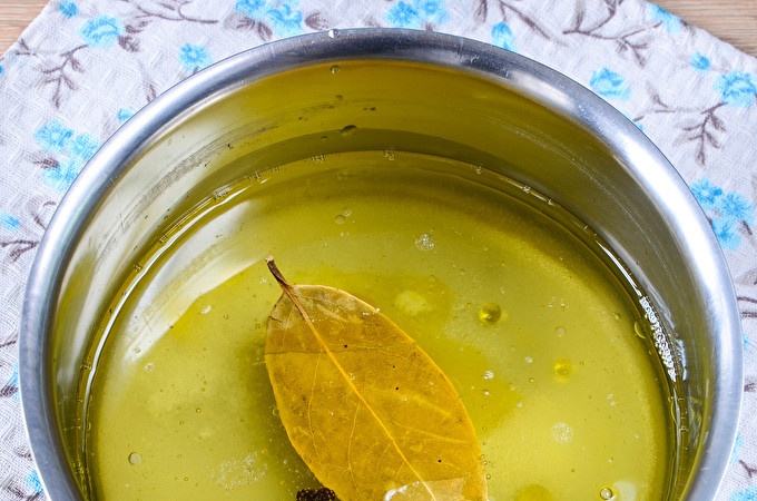 Per preparar la marinada, barregeu amb una salsa purificada, sal, sucre granulat, oli de gira-sol, fulla de llorer i grans de pebre negre en una cassola o cassola petita. Poseu el foc i deixeu-ho bullir. Després de bullir, conserveu-ho al foc mínim durant 5 minuts. Al final, aboqueu-hi vinagre i traieu-ho del foc. Deixeu refredar completament.