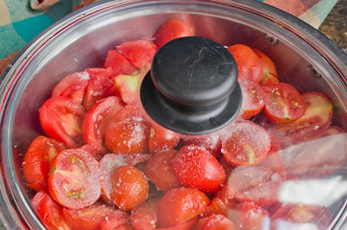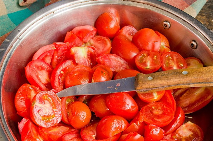 Agafem una cassola amb un fons ample i gruixut, abocem un got d’aigua bullent, posem els tomàquets grans en una cassola. El petit es pot tallar per la meitat, gran en 4 parts.