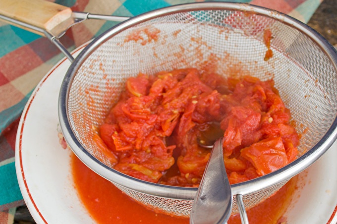 Es torna a posar una massa calenta al tamís. L’aigua colada barrejada amb el tomàquet es pot utilitzar per fer sopa de verdures, no cal, ja que només augmenta el temps de cocció.