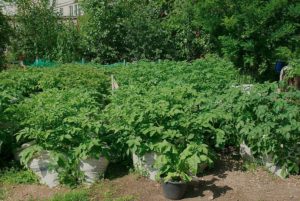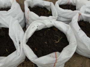 Les més adequades són les bosses de plàstic amb un volum de 30 a 75 litres. Una planta es planta en contenidors de mida petita, dos arbustos es col • locaran bé en una bossa de seixanta litres i tres en una bossa de 75 litres. Com més dens és el teixit, menys risc es trenca el fons. La millor opció són les bosses de sucre. Aquest embalatge serà durador i durarà més d'una temporada. A més, l'estructura teixida de la tela de tela no permetrà que l'aigua es resti. També es proporciona accés d’oxigen a les arrels d'aquests envasos.