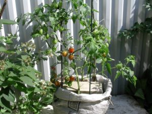 La meva primera experiència amb el cultiu de tomàquets a les bosses no va tenir èxit. Com a contenidor, vaig fer servir grans bosses de plàstic. Les bosses plenes eren massa "fines" i inestables. Vaig haver de fer-los una mica de terra i prémer-los amb maons, però durant la temporada els vaig corregir constantment. Sens dubte, no va afectar el rendiment. Els tomàquets es van posar vermells als arbustos.